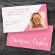 Influencer or blogger profile business cards with your name on the front in a trendy handwritten script font. Add your photo, social media handle and website on the back and customize the QR code. Pink and white design. Colors can be customized with the design tool.