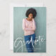 This trendy, elegant 2024 graduation announcement features two photos of the college or high school graduate. Casual, modern white script appears on an overlay along with two photos of the graduate. You can adjust the wording on the back of the card to make this either a simple graduation announcement, or a grad party invitation. A stylish and simple graduation design for the class of 2024!