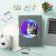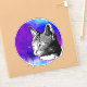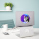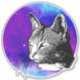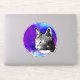 Get unique with your laptop decor with this trendy sticker. It has a black and white detailed cat design. The background is a round circle purple and blue space nebula. Space cats are forever!