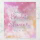 Modern personalised bridal shower wine bottle label design featuring a sparkly white gown on a pink gradient bokeh background.