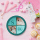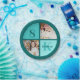 Trendy 2 photo personalized teal happy birthday party round paper plates for a little girl or young woman. Celebrate your child's birthday with beautiful photographs of them on this add your own two photographs with chic turquoise squares. Add their name and age.