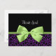 Say thank you with this trendy purple and black thank you postcard with a giraffe print and a cute green ribbon tied in a bow. Blank on back.