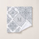 Personalised bath towel set in trendy tile print in neutral shades of grey and white. The design features an abstract pattern of blended Mediterranean tiles and two tone grey panels. The template is set up for you to add your monogram or initial to the wash cloth and your custom text (such as your family name, business name or property address) to the bath towel.
