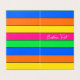 Trendy vivid solid stripe pattern design featuring stripy lines of solid colours overlaid with custom text. The custom text can be personailzed for a special greeting or name or any other text as required. It can also be removed for a stripe pattern without any words. The solid colours are bright neon colours of pink, yellow, orange, green, or blue, interspersed with thin black lines.