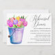 Trendy rustic style rehearsal dinner invitations with watercolor bucket of tulips and white and pale blue striped pattern on the reverse of the card. These invites are perfect for a country, farmhouse, garden party or barnyard or style wedding shower.
