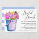 Trendy rustic style bridal shower invitations with watercolor bucket of tulips and white and pale blue striped pattern on the reverse of the card. These invites are perfect for a country, farmhouse, garden party or barnyard or style wedding shower.