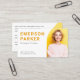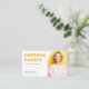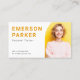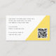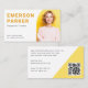 Trendy, yellow and white, business cards with your photo on the front along with name, title and a custom slogan or other text. Add your contact information and other info to the back and customise the QR code. Background and font colours can be customised in the design tool.