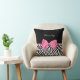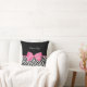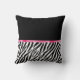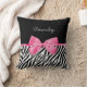 A trendy black and white zebra print square throw pillow decorated with a picture of a chic hot pink ribbon tied into a girly bow. Personalise this fashionable pink and black animal print design by adding the name of your favourite girl. Flat printed image, NOT actual bow.
