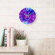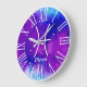 Trendy zodiac Pisces symbol wall clock featuring a pretty purple and blue space nebula design.