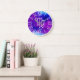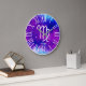 Trendy zodiac Virgo symbol wall clock featuring a pretty purple and blue space nebula design.