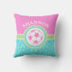 Cute personalised girl's soccer square throw pillow with a cool tri-coloured pastel design. There is a soft pink, lovely green, and incredible aqua in this design. It also has a pretty pink soccer ball in the middle! Use the custom text field to add a name before you order. Or if you prefer, leave the text field blank for no name.