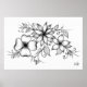 Graphite pencil sketch of three pretty flowers, highlighted by multiple leaves and scrolly vines. © Alina Davis 2014