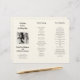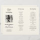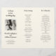 Ecru coloured, tri-fold wedding ceremony program with photo template which will show on the front. Fold this 8.5 x 11 inches paper into thirds, accordion like, and fill in three sections with the "order of the ceremony" and list the "wedding party" members. Also add "in memory of" and / or "thank you" to family and guests. Choose white, or another paper type, as you prefer.