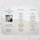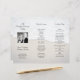 Sea coast wedding program template to fold into thirds. The background is beach sand with white surf. The front of the program has a photo template to include a picture of the couple. Black text templates on all three sections are easy to customise with ceremony information. The paper will need to be folded accordion style after purchase, and double check all text as no one will proofread your wording. The back side of this paper also contains the sea coast image.