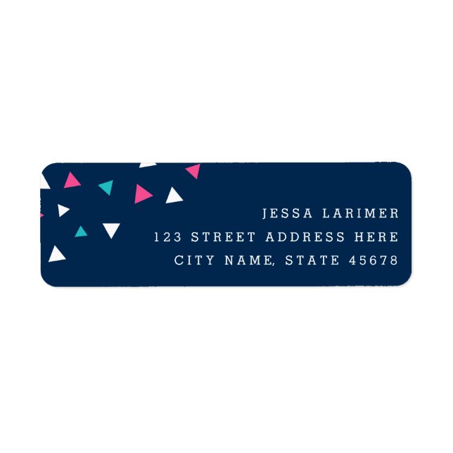 Pink, aqua, and white triangle confetti design on the left. Name and Address on the right. Background colour can be customised to any colour you'd like.
