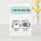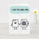 This design shows two friendly household appliances drawn with thick black outlines, standing close together on a white background patterned with faint gray triangles. The one on the left has a wide pink smile and an arm extended, gently holding onto its companion in a cozy, affectionate pose ❤️. The partner on the right has a round front opening with the door slightly ajar, revealing a red heart tucked inside like a sweet secret between close friends. Above them, an aquamarine speech bubble sits near the top and contains the message “I LOVE YOU LOADS, MOM” in dark, chunky lettering. The spacing keeps the words centered in the bubble, with the characters directly below so the message feels like it’s spoken to the pair. Soft pastel touches balance the strong pink and red accents, giving the scene a light, caring tone 🌼. The right figure’s open door angles outward, and the bright heart sits clearly in the middle of the circular opening.