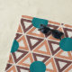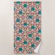 This beach towel has a geometric design of repeating brown and tan triangles with turquoise circles on top on a field of off-white. Want the same design in different colours? Message me.