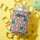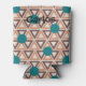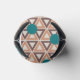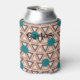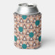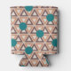 This can cooler has a geometric design of repeating brown and tan triangles with turquoise circles on top on a field of off-white. Want the same design in different colours? Message me.