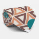 This necktie has a geometric design of repeating brown and tan triangles with turquoise circles on top on a field of off-white.