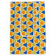 Blue and orange triangles and golden stars on a pale yellow background, abstract geometric pattern.