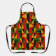 This apron has a Black History design of triangles and rectangles in gold, red, green, and black making a pattern.