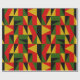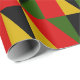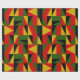 This wrapping paper has a Black History design of triangles and rectangles in gold, red, green, and black making a pattern.