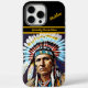 A Native Indian stands proudly, adorned in traditional attire and a vibrant feathered headdress. The intricate designs and colours reflect deep cultural significance, capturing a moment of heritage.