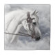 A beautiful white horse with a tribal type bridle and a background of clouds. A pretty horse art tile.
