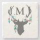 Stylish monogrammed stone coaster, with graphics of a grey stag's head silhouette decorated with colourful flowers and feathers. Personalise the grey bold one letter monogram to suit your needs. Great gift idea for anyone.