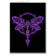 This tribal dragonfly design is decorated with intricate swirls and dot patterns. The delicate lines are painted with a deep, highlighted purple giving the image a subtle shine. This symmetrical pattern has a thin circle in behind the dragonfly with tiny dots running along the outer edge. The background of this card is finished with a pure black creating a nice contrast. This stylised design is a striking representation of this wonderful little flying creature.