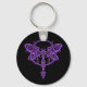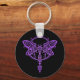 This tribal dragonfly design is decorated with intricate swirls and dot patterns. The delicate lines are painted with a deep, highlighted purple giving the image a subtle shine. This symmetrical pattern has a thin circle in behind the dragonfly with tiny dots running along the outer edge. The background of this keychain is finished with a pure black creating a nice contrast. This stylised design is a striking representation of this wonderful little flying creature.