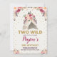 Rustic boho floral 2nd birthday Invitation featuring watercolor roses, feathers and a cute teepee - perfect for bohemian-themed TWO WILD birthday celebration!