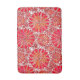 Bathmat in a modern tribal / ethnic print of nested mandala wheels and triangles, with a tropical feel - shades of deep coral red and coral pink, accented with orange and white