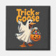 Funny Halloween goose in a spooky ghost costume with a pumpkin bucket full of candy. Perfect for humour-loving fans of Halloween and mischievous birds.