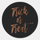 Trick or Treat Black and Orange Halloween Sticker. The Trick or Treat sticker uses the popular gold foil typography. This sticker is used to seal Trick or Treat Black and Orange Halloween Invitations.