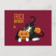 This postcard features playful geometric black and white cats with the words 'Trick or Treat' in a Halloween-themed design. One of the cats is even wearing a pumpkin as a Halloween mask, adding an adorable touch to the overall fun and festive look.