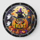 This round wall clock features a whimsical Halloween scene with a black cat in a witch's hat perched on a carved "TRICK OR TREAT" pumpkin. Ghosts, bats, and small pumpkins float against a full moon backdrop, alongside a witch's broom. It's a delightful and spooky addition to any Halloween decor.