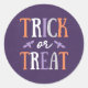 Festive Halloween stickers featuring a purple chalkboard background and colourful typography with the words "Trick or Treat" with two bats. Use these cute Halloween stickers for envelope seals, Halloween party favours, and more!