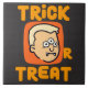 The phrase Trick or Treat with a funny halloween drawing depicting a Vampire's head on an Orange background.