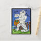 Image is from my original colour pencil drawing. This silly mummy is out trick or treating with his pumpkin full of candy and has found himself tangled on a wooden fence. The text reads Trick or Treat. See my store Art by MAR for matching products with this design.