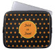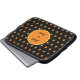 A black background with orange polka dots... orange centre circle with black lettering and yellow accents...
