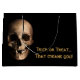 Skull on black background with "Trick or Treat…That Means You!" in golden lettering. Very large candy bag with handle.