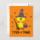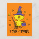 This little chick is all dressed up for Halloween in a magical witch's hat, with her broom and treat bag. Text says TRICK OR TWEET. Adorable and funny for your little trick or treaters this Halloween. PinkInkArt original!