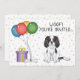 Cute birthday theme design featuring Destei's original cartoon illustration of a cute tricolor colour Cavalier King Charles Spaniel breed dog. Next to the dog there are colourful birthday balloons tied on a dog bone and a purple and yellow colour present box. The background has a playful pattern of colourful pastel confetti on a white background. Personalise the sample text areas with the details of your event.