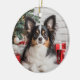 This adorable Christmas ornament, featuring a tricolor Papillon lying under a Christmas tree, is a wonderful gift for any Papillon lover.