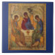vintage art with mediaeval christian painting by andre rublev of his interpretation of the trinity with three angels with golden wings sitting around a table with a golden chalice.