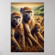 Three energetic monkeys playfully cavort in a lush green field, their lively antics captured in a vibrant painting bursting with colour and movement.