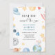 Trip around the sun birthday invitation featuring a watercolor astronaut and space elements including planets, stars, a rocket and UFO. Personalise with your information or click "Click to customise further" to edit font styles, size and colours.