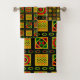 This towel set has a Black History design of circles, triangles, diamonds, lines, and zigzags forming a pattern.