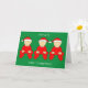 Three cartoon babies sitting in a row wearing red outfits and Santa hats. The image has green coloured background and is accompanied by the words 'Triplets First Christmas'.